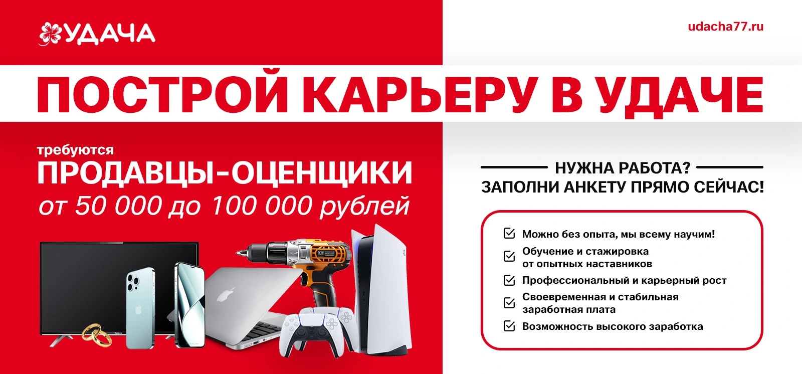 Сеть комиссионных магазинов "Удача" работает 24 часа. Мы осуществляем продажу и покупку техники, инструментов, ювелирных изделий и других вещей. Каждый клиент может не только совершить покупку онлайн или в магазине, но и воспользоваться услугами оценки товара онлайн, trade - in.